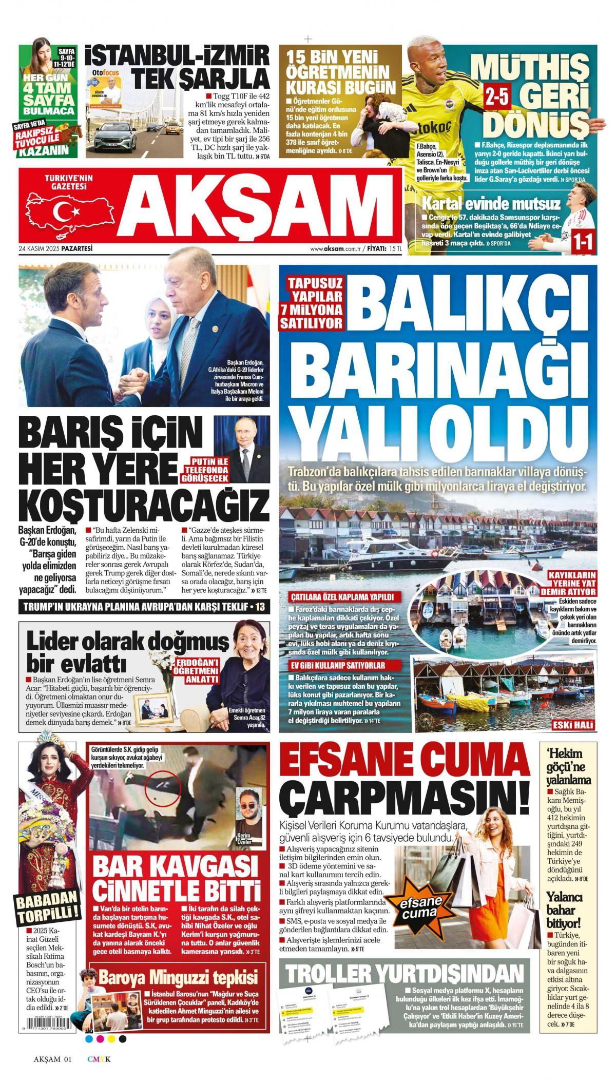 Akşam Gazetesi 24 Kasım 2025 Günü Manşeti
