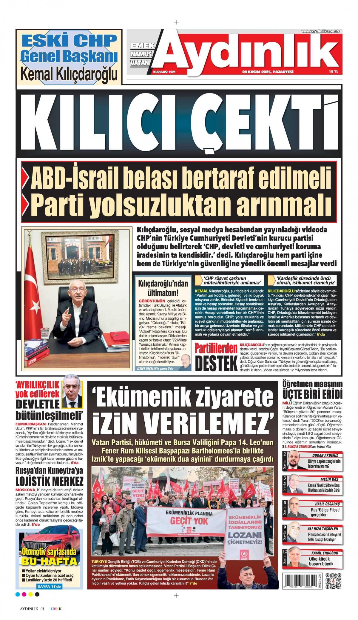 Aydınlık Gazetesi 24 Kasım 2025 Günü Manşeti