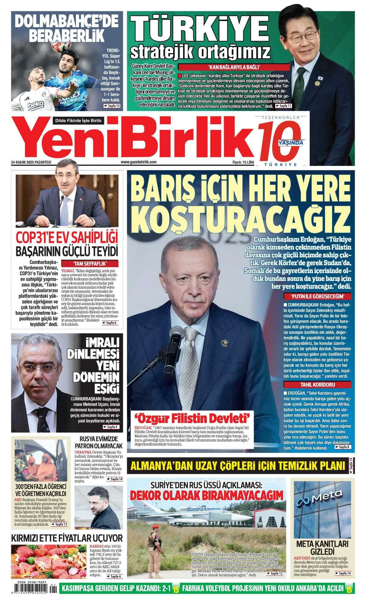 Yeni Birlik Gazetesi 24 Kasım 2025 Günü Manşeti